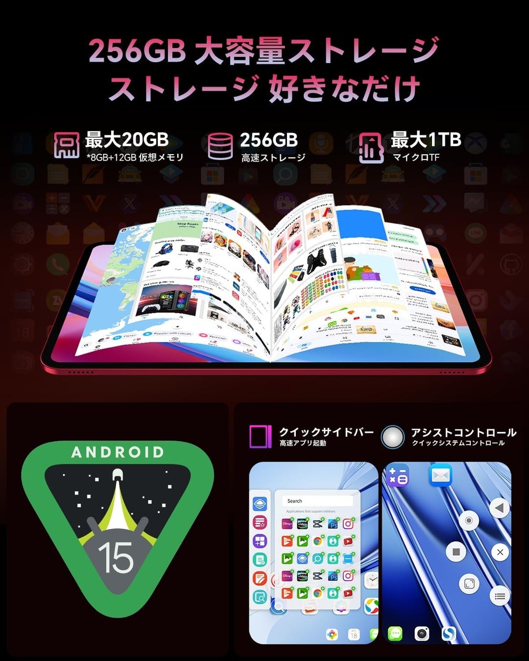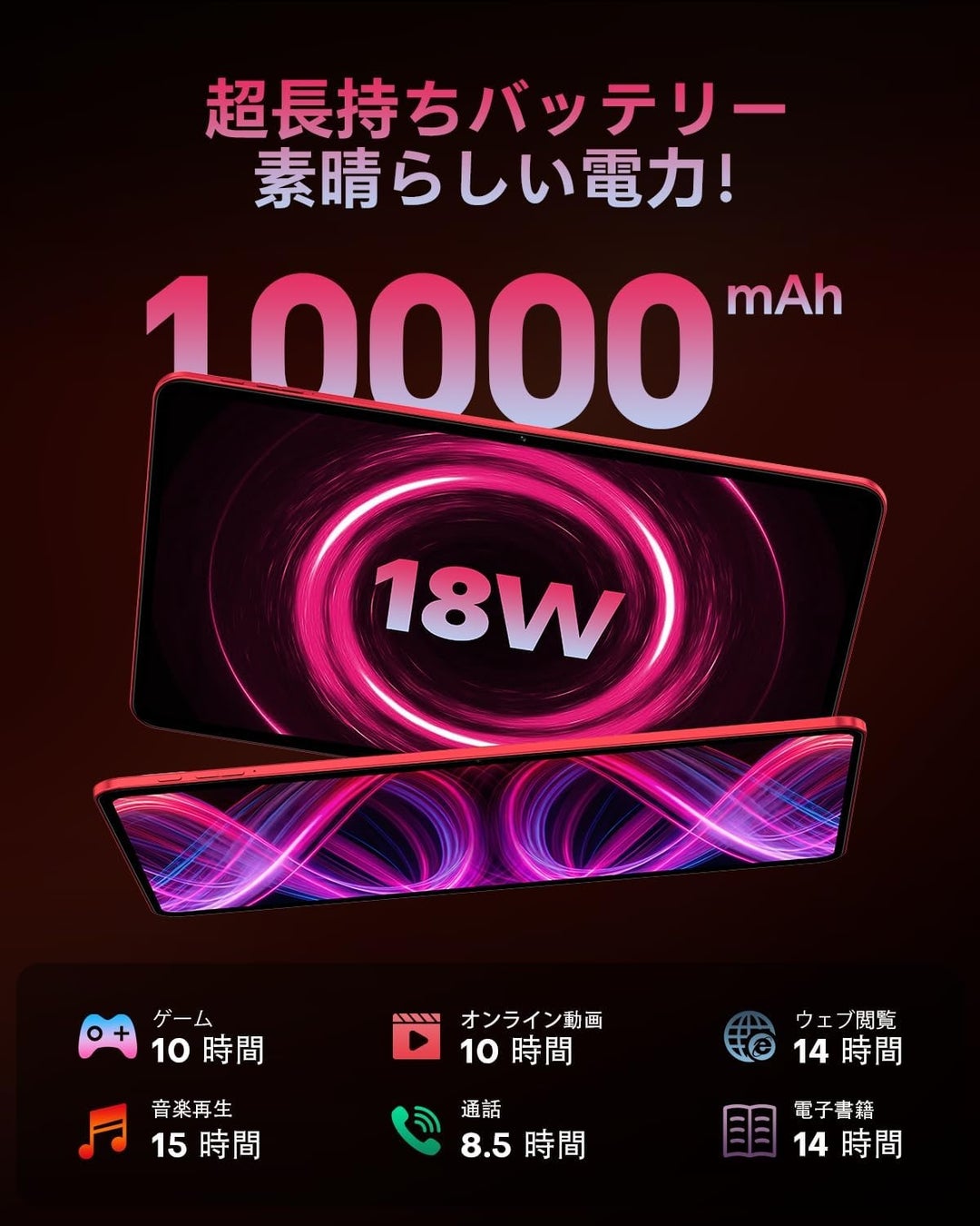 【10000mAhバッテリー、PD 18W急速充電、20GB RAM+256GB ROM+1TB拡張可能、顔認証】このAndroid 15 タブレット T65Plus は、長時間の使用にも充分耐える10000mAh バッテリーを搭載し、外出先での作業や娯楽も安心して楽しめます。