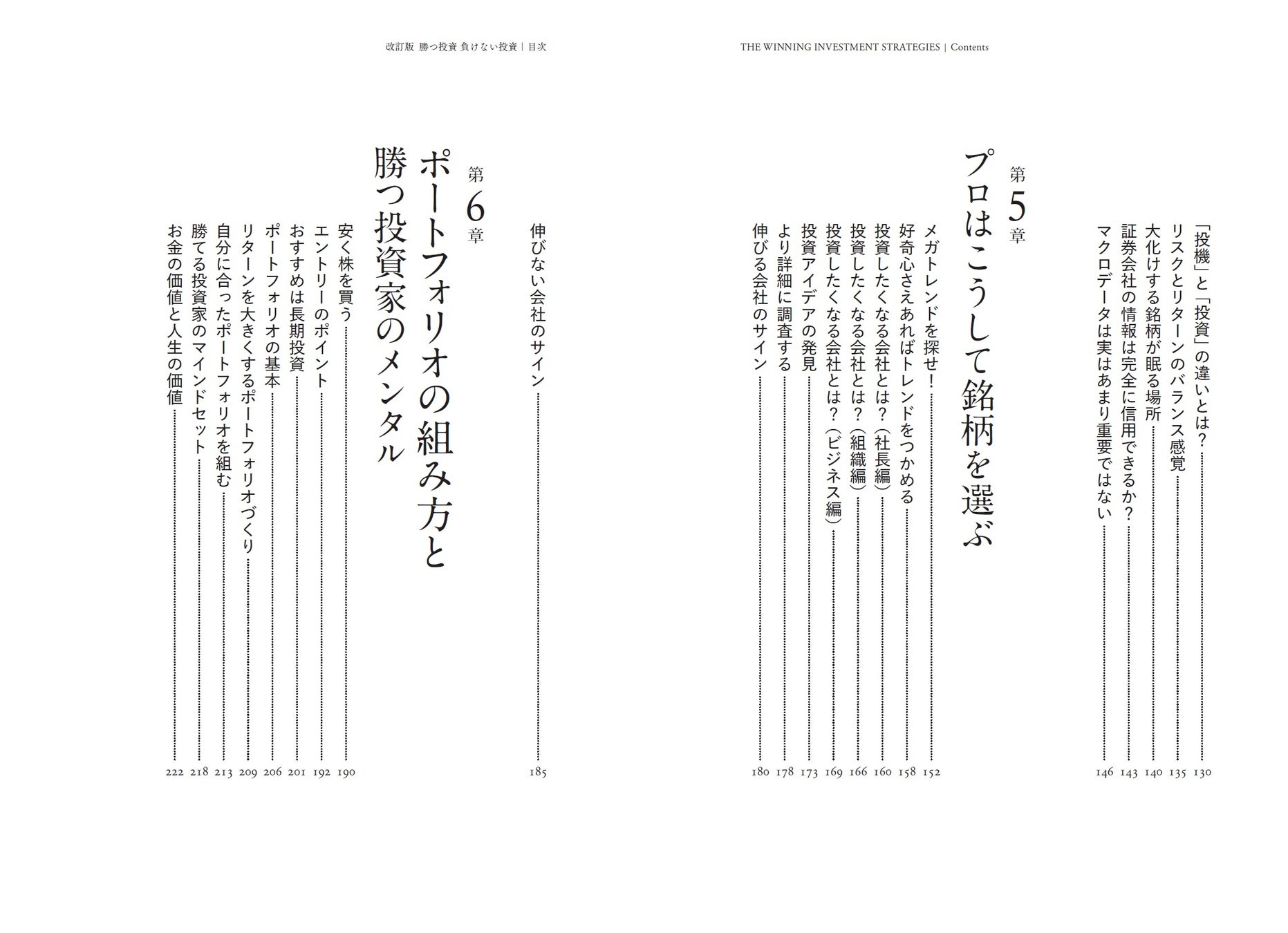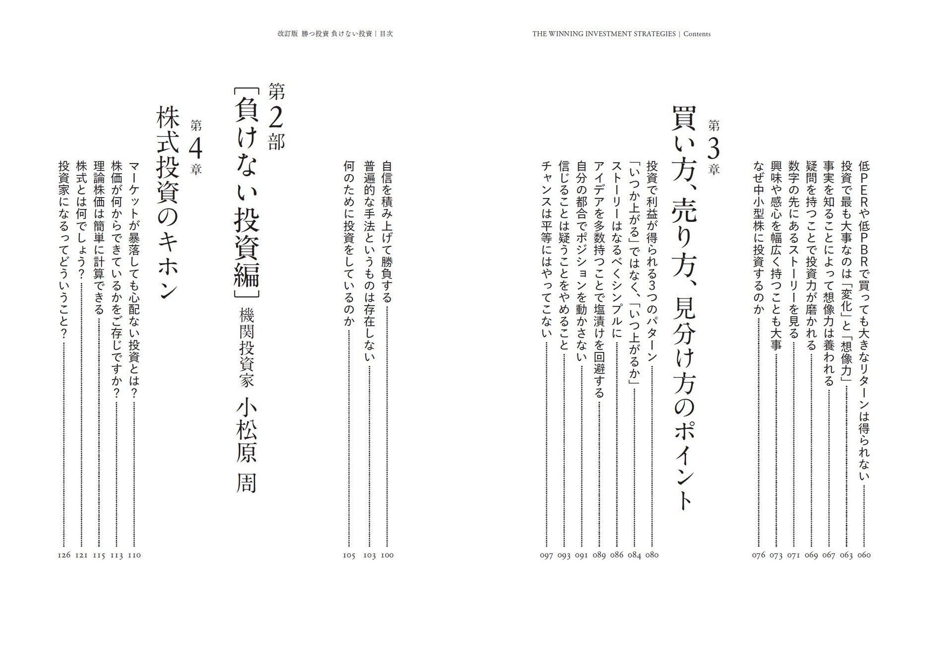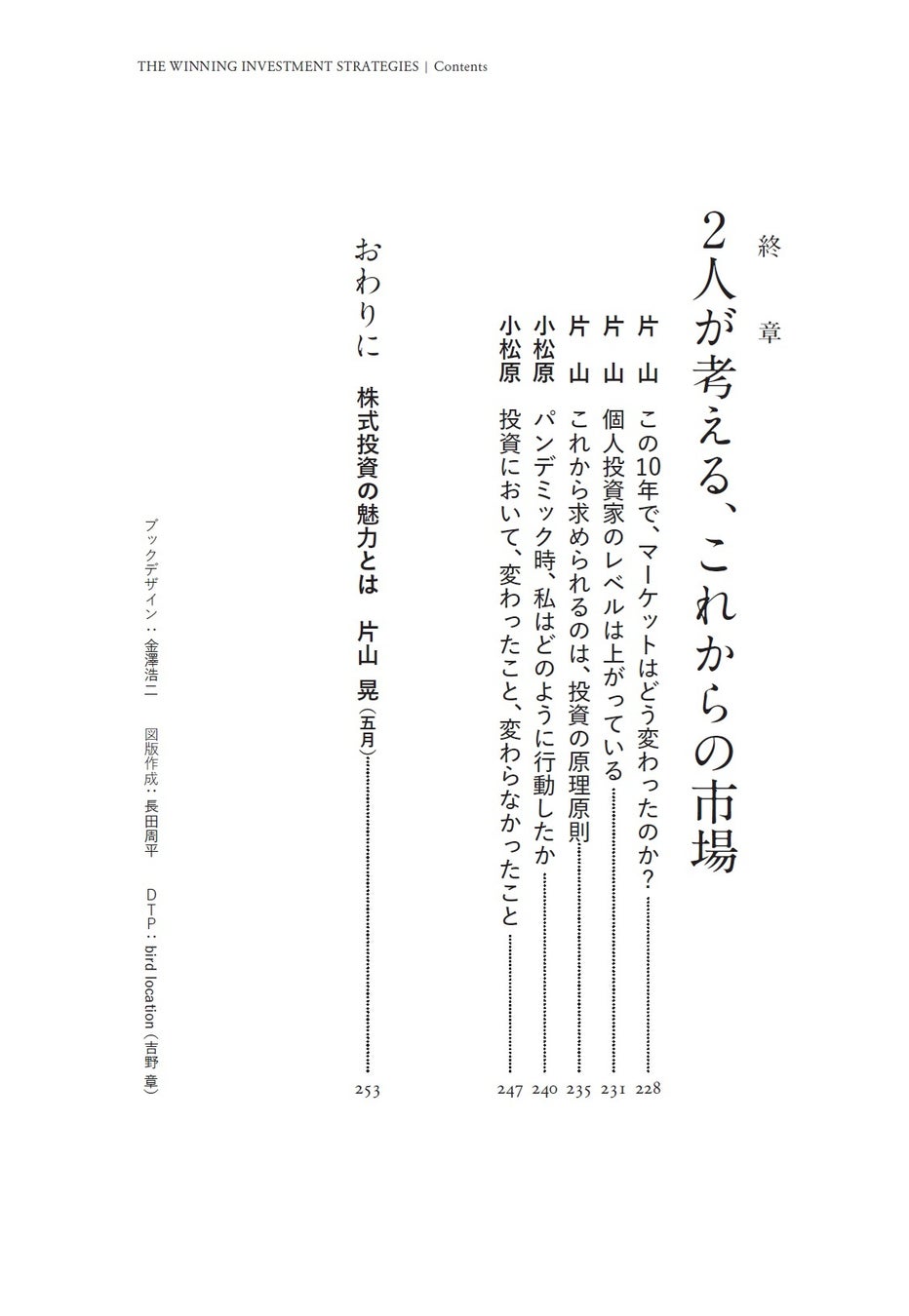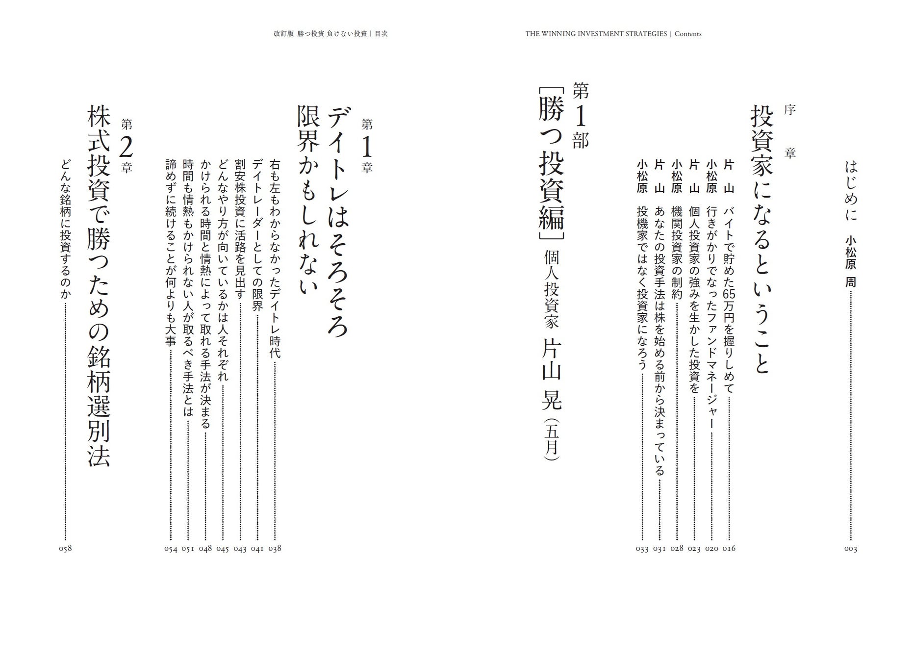 本書はこのような時代背景を踏まえ、投資の本質を知りたい、正しい知識を持った投資家になりたいと思うすべての人に対して、片山氏流の「勝つ投資」と小松原氏流の「負けない投資」の考え方をまとめています。