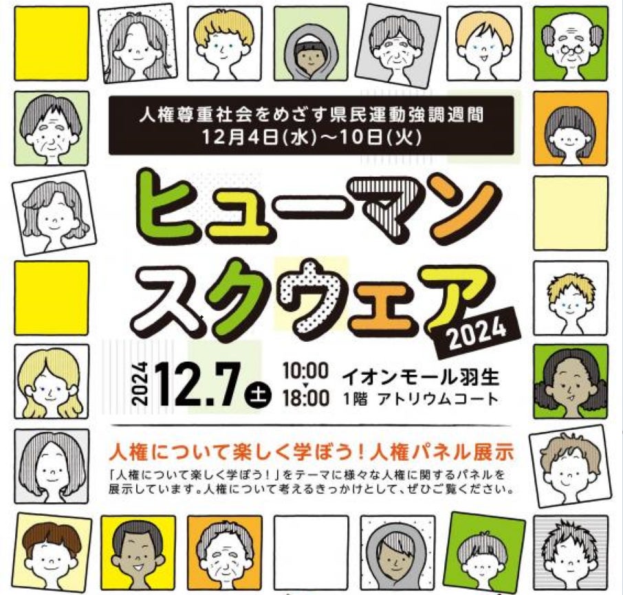 このたび、羽生市や埼玉県人権啓発活動ネットワーク協議会等と連携し、パネル展 示等を通じて様々な人権について紹介するイベント「ヒューマンスクウェア2024」を開催します。