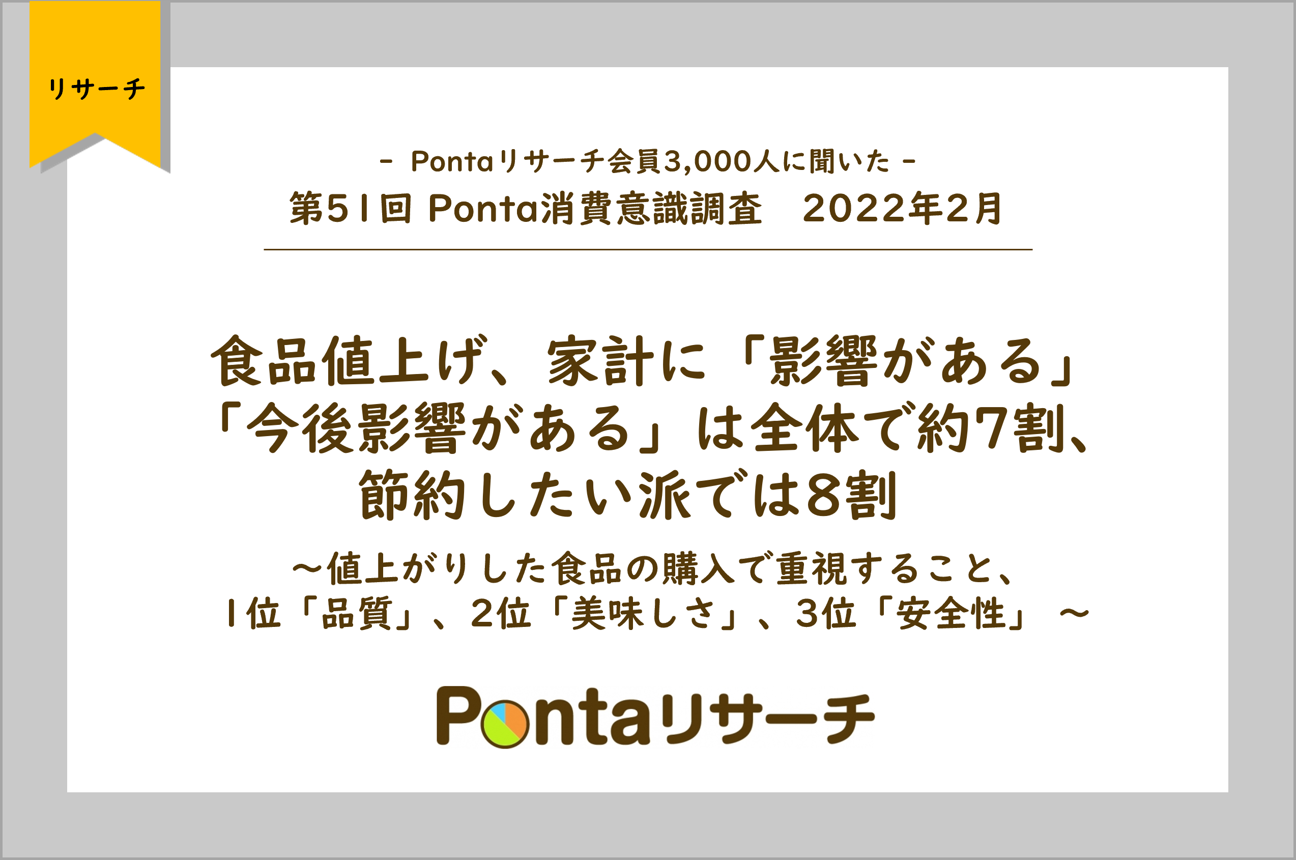 第51回 Ponta消費意識調査 2022年2月発表 食品値上げ、家計に「影響がある」「今後影響がある」は全体で約7割、節約したい派では8割