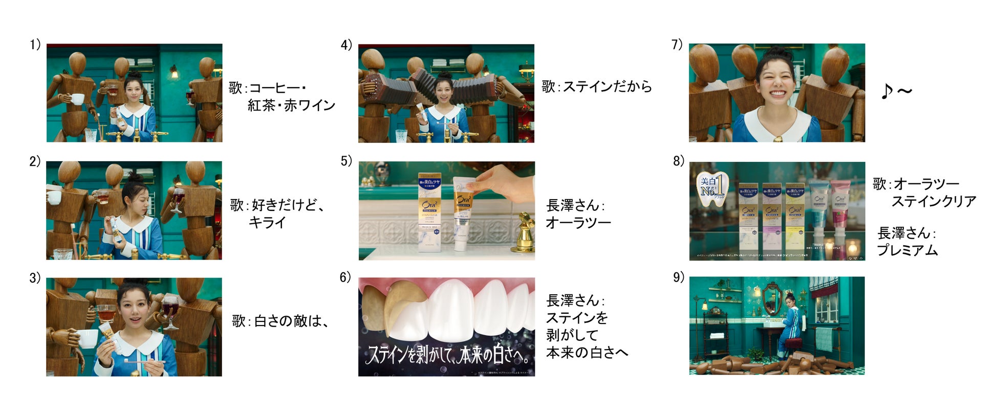 歯の着色汚れステインを擬人化した「ステイン3兄弟」が差し出すコーヒー、紅茶、赤ワインの誘惑に悩みながらも、オーラツーのステインクリアで歯本来の白さと輝きを保ち笑顔になれる様子を描きました。注目の若手俳優・長澤樹さんを起用し、黒田秀樹監督による過去のヒットCMを彷彿とさせる印象的な音楽と演出で、「白さの敵は、ステインだから」というメッセージと「オーラツー プレミアム」の世界観や機能性を伝える内容に仕上げました。