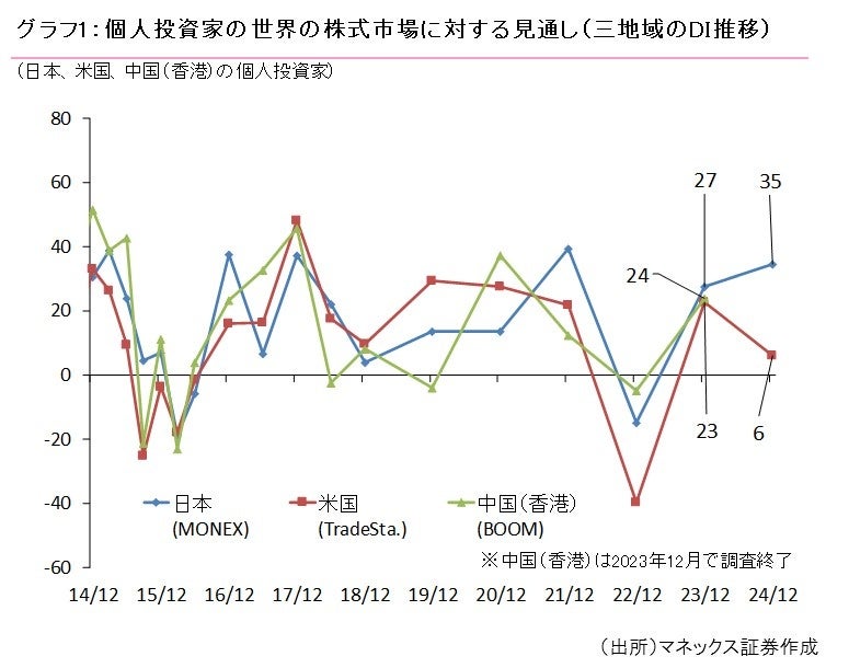 マネックス証券は2009年10月より、個人投資家を対象として相場環境についての意識調査のアンケートを実施し「MONEX個人投資家サーベイ」として提供しおります。2011年6月から2023年12月まではマネックス証券、TradeStation Securities, Inc.およびMonex Boom Securities (H.K.) Limitedの3社共同で「MONEXグローバル個人投資家サーベイ」を実施し、日本、米国および中国(香港)の個人投資家の相場環境についての意識を定点観測してきました。2024年12月からはマネックス証券とTradeStation Securities, Inc.の2社で日本と米国の個人投資家の相場環境についての意識調査を行います。