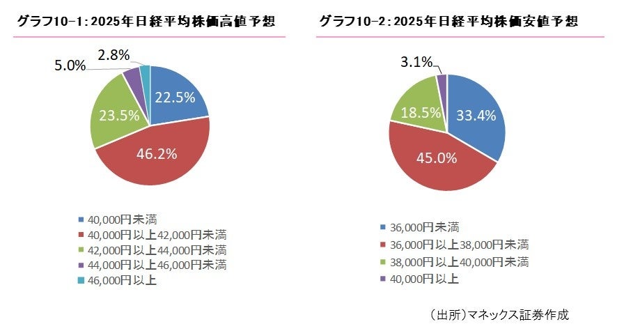 2025年の日経平均株価の高値および安値の予想をたずねたところ、高値予想は「40,000円以上42,000円未満」が最多で46.2%となりました。安値予想は「36,000円以上38,000円未満」が最多で45.0%となっています。