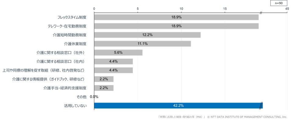 また、勤務先で制度が導入されていると回答した介護経験者(n=90)のうち、「いずれの制度も活用していない」との回答が42.2%に上り、制度整備が進む中でも、実際の利活用は限定的であることが示されました(図表4)。