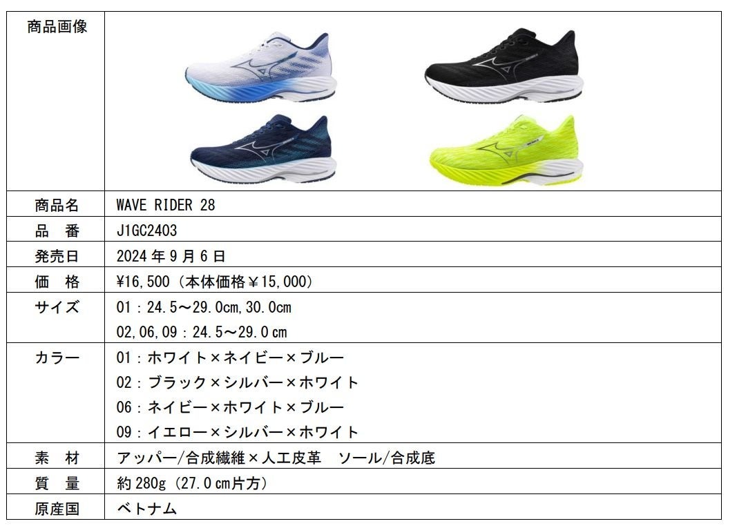 ミズノは、踵部のクッション性が前作※1より約20%アップ※2したランニングシューズ「WAVE RIDER 28(ウエーブライダー トゥエンティエイト)」を全国のミズノランニング品取扱店で9月6日に発売します。