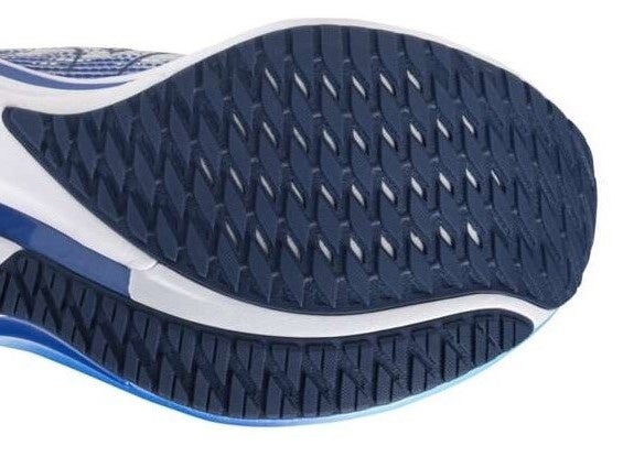 アウトソール部の意匠は、過度な屈曲を抑える設計にすることにより、スムーズな体重移動と力強い蹴り出しをサポートします(図1)。ミッドソール部は、踵からつま先まで12mmのドロップをつけることにより、体を自然に前方に押し出すような設計にしています。また、ミズノ独自の高反発素材『MIZUNO ENERZY』と『MIZUNO ENERZY NXT』を組み合わせることで、クッション性が前作から約20%、反発性が約15%アップしました。『MIZUNO ENERZY』と『MIZUNO ENERZY NXT』間にクッション性と安定性の両立を実現するミズノの基幹機能『MIZUNO WAVE(ミズノ ウエーブ)』を入れることで、クッション性を犠牲にせずに安定性をサポートし、より前足への体重移動がスムーズになりました(図2)。 アッパー部分の素材は、柔らかい『ジャガードエアメッシュ』を採用することで足当たりの良さを追求しています。また、ヒール部の形状を変更することで着用する際に足入れしやすい設計にしています(図3)。