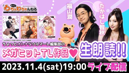 本特番では、声優の福山潤さん、たかはし智秋さんが出演し、「コミックシーモア」発のメガヒットTLコミック「オネエ系ヤクザに毎晩溺愛されてます」、「キスでふさいで、バレないで。」、「年下メダリストは一途な獣 ~身長差40センチ、私たちの愛の育み方~」を取り上げます。YouTubeチャンネル『わちゃわちゃんねる』でも大人気のコーナー「作品朗読」はもちろん、「オトナの心理テスト」、バイノーラルマイクを使った「告白セリフ」企画など、本番組ニコニコチャンネル『もっと!わちゃわちゃんねる』だけの特別企画が盛り沢山。声優ファン、作品ファンが楽しめる企画を予定しています。