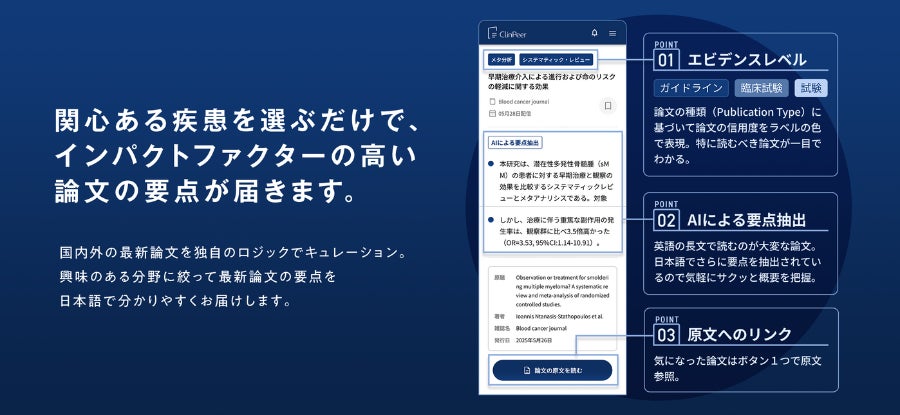 「ClinPeer」の拡大により、細分化された疾患領域の中から関心ある疾患を選択するだけで重要な論文情報を収集できるようになります。これにより、情報過多による医師の負担軽減に加え、情報格差を是正し、より多くの医師がエビデンスに基づいた最適な医療を提供できる環境を支援することを目指しています。