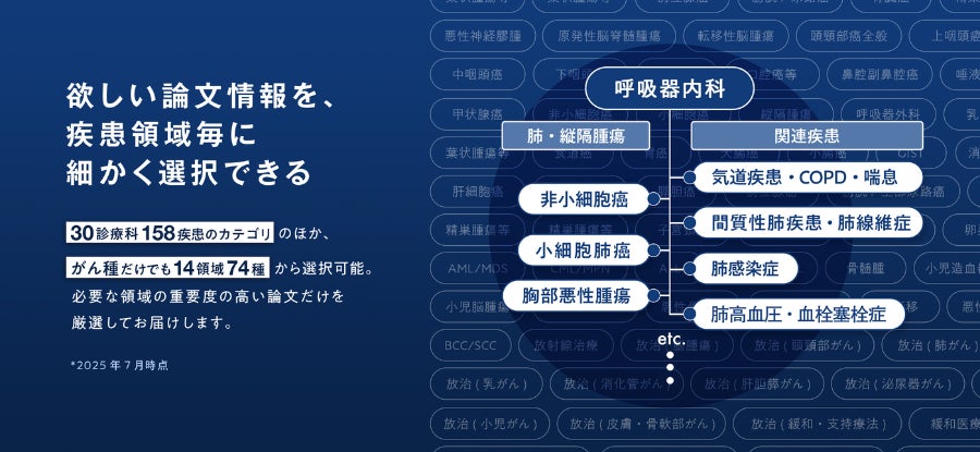 これにより、従来のがん疾患(がん14領域74種)に加え、30診療科158疾患まで網羅することで、より多くの医師が専門分野・非専門分野を問わず、最新の論文情報を効率的に収集し、日々の診療に役立てられるようになります。