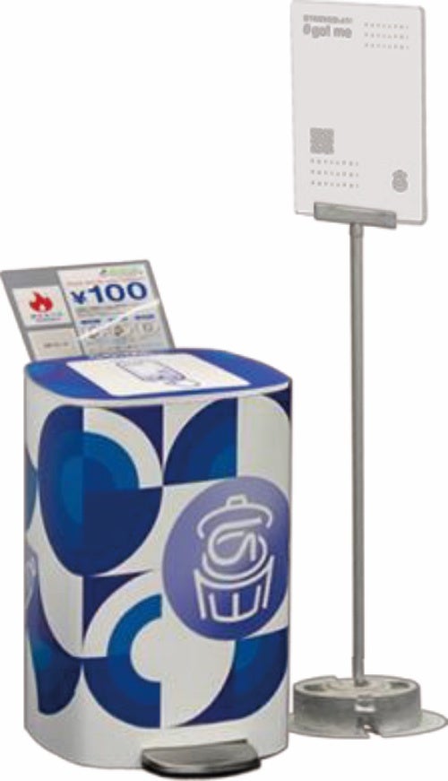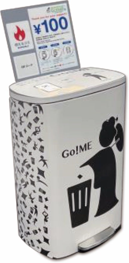 ① 参画店舗が「Go!ME」専用オリジナルデザインごみ箱を設置します。