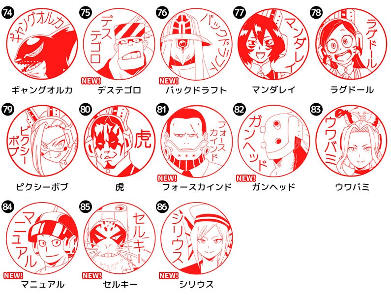 エッジショット、バブルガール、センチピーダー、ロックロック、デステゴロetc。ヒロアカの好きなキャラクターで作れるオーダーメイドはんこに、SNSから寄せられた声に応えて15キャラクターが追加。