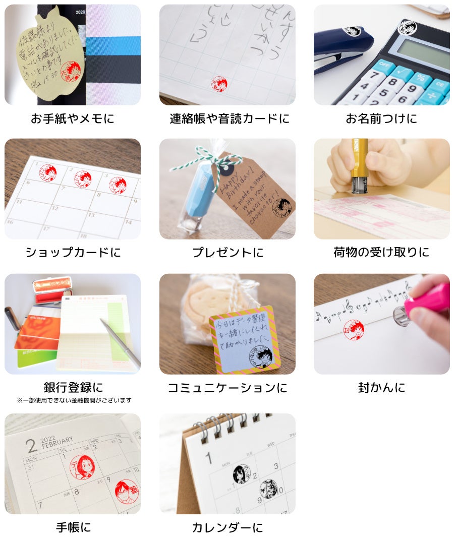 荷物の受け取りやメモなどへのサイン替わり、持ちものへのお名前つけ、お子さまの連絡帳や音読カードなどにポンポン押せるセルフインクタイプ、全国ほとんどの金融機関にも登録できる木彫りタイプ、黒水牛タイプから選べます。