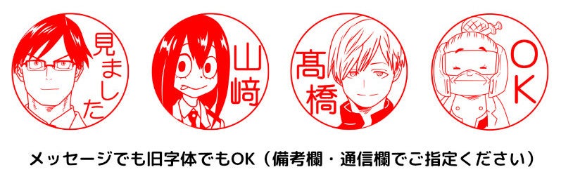 苗字や名前はもちろん、旧字体、ペンネームやハンドルネームのほか、「OK」「見ました」「ありがとう」といったメッセージを入れることも(漢字3文字・ひらがなカタカナ5文字・アルファベット6文字まで。イラスト見本のようなキャラ名のままでの制作もOKです)。