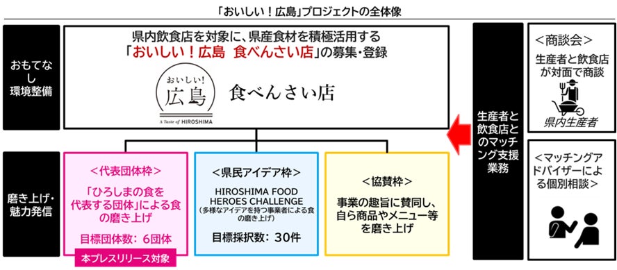 広島県では、県産農林水産物の販路・消費拡大を目的に、昨年5月に開催されたG7広島サミットを契機に、県の多彩な食資産を多様な主体と磨き上げるとともに、その魅力を発信をする「おいしい!広島」プロジェクト(以下、「本プロジェクト」)を推進しています。