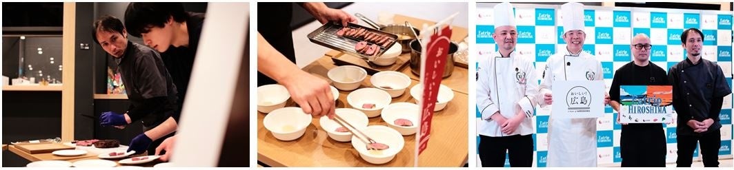 プレス向けの試食会では、料理人自らがとりわけを行い、会場に集まった関係者に磨き上げた一品を振る舞いました。関係者からは、「どのメニューも広島和牛のうまみや風味が引き出された料理に磨き上げられていた」といった声が聞かれました。