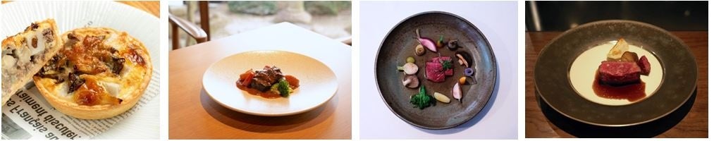 左から石岡氏(ホテル宮島別荘)による「比婆牛と広島産里芋とキノコのキッシュ宮島ハチミツ添え」、黒越氏(宮島レ・クロ)による「広島和牛のブリスケ 赤ワイン煮込み」、永野氏(Éditer)による「北広島町森下牧場黒毛和牛モモ肉と北広島町産お野菜 ポトフ仕立て」、廣戸氏(hiroto)による「榊山牛ロースのグリル」