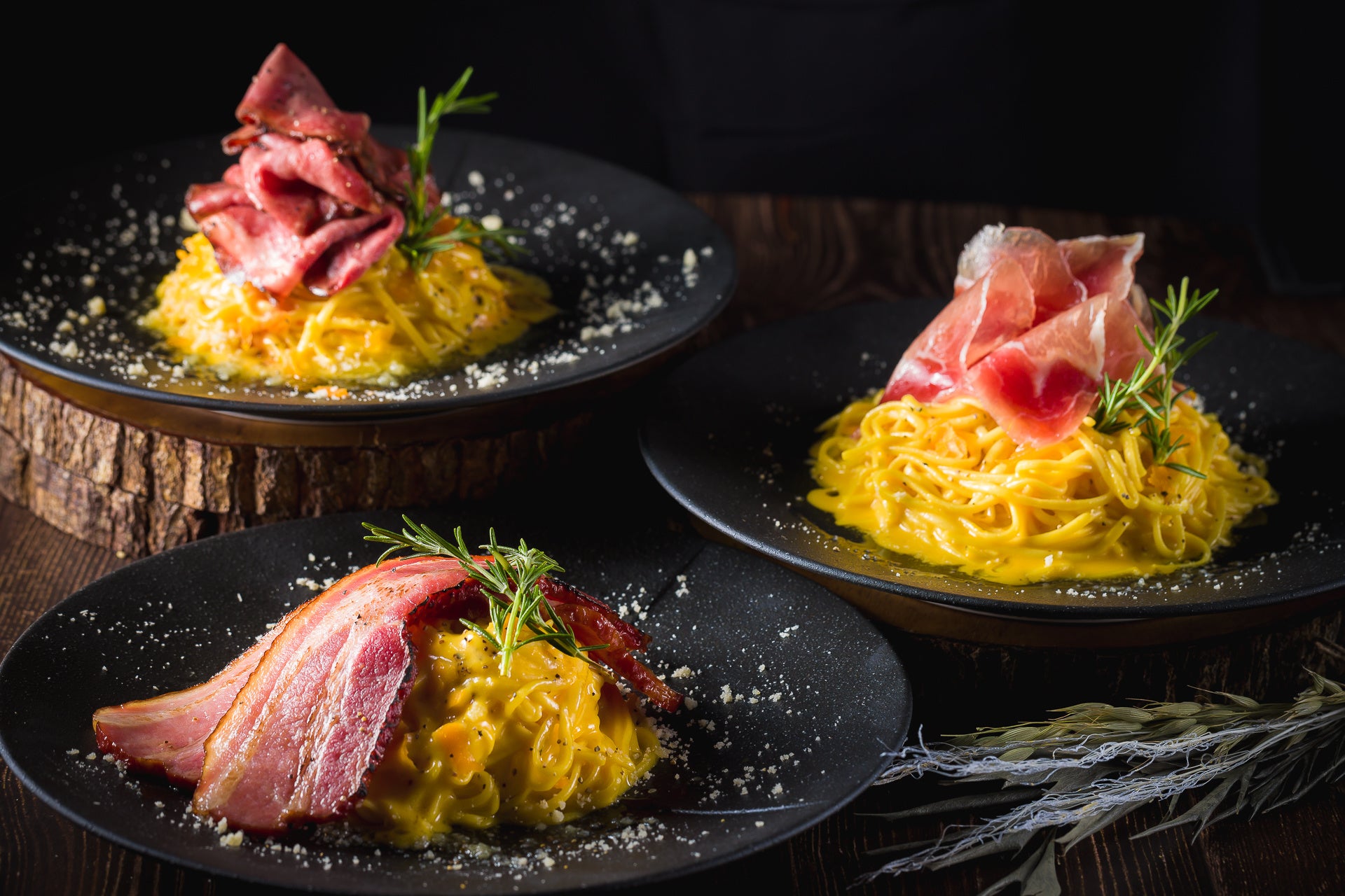 ベースとなる特製カルボナーラの美味しさはそのままに、食べ応え抜群の三種類をご用意いたしました。豪快でフォトジェニックな見た目も、非日常体験を味わえる一皿です。