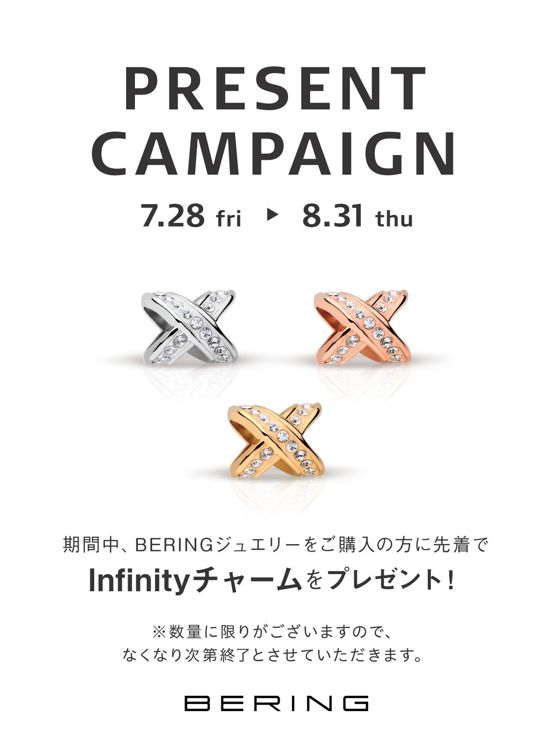 内容:期間中に対象店舗にてBERING Jewelleryをご購入のお客様に、先着でBERING Jewelleryのチャームをプレゼント。無くなり次第終了します。