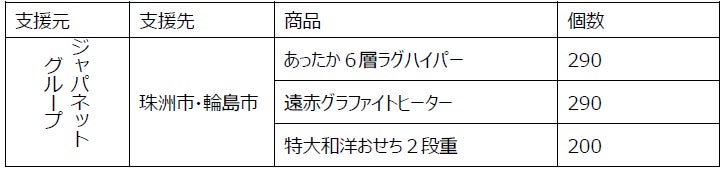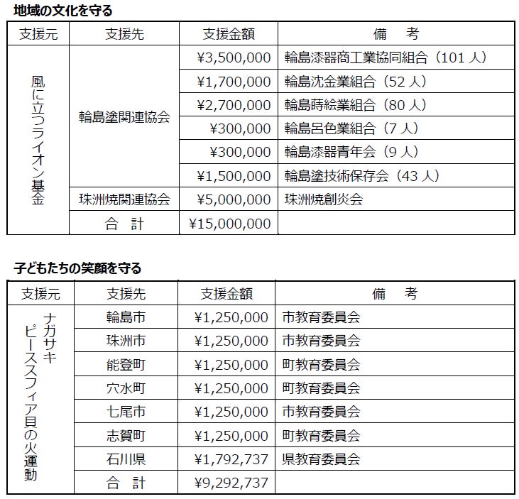 寄付金総額¥24,292,737のうち、輪島塗関連協会6団体へ総額1,000万円、珠洲焼創炎会へ500万円を公益財団法人風に立つライオン基金(所在地:東京都港区、代表:古竹孝一)を通じて寄付。能登6市町と石川県の教育委員会へ929万2,737円を特定非営利活動法人ナガサキピーススフィア貝の火運動(所在地:長崎県長崎市 代表:松田裕二)を通じて寄付。それぞれ「能登の文化を守るために」「子どもたちの笑顔を守るために」役立てていただきます。
