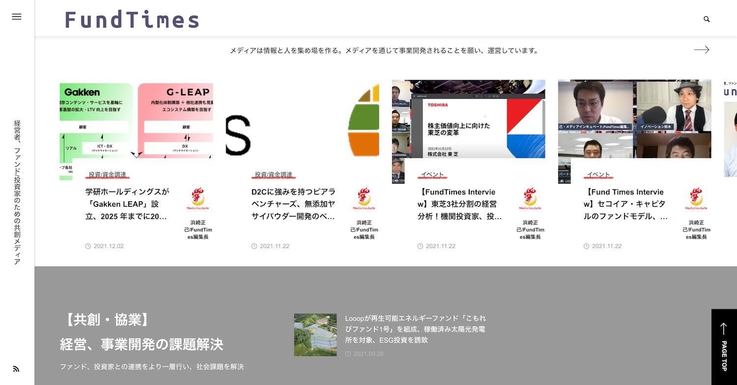 2022年11月2日(水)、未来を切り拓こうとする方々を応援する株式会社メディアインキュベート(代表取締役:浜崎 正己)は、経営者、ファンド/投資家のための共創メディア「FundTimes」(https://media-incubate.com/fundtimes/)にて、コーポレート・ベンチャー・キャピタル(CVC)特集企画をスタートいたします。経営者、投資家、新規事業担当者の方々を取材させていただきます。