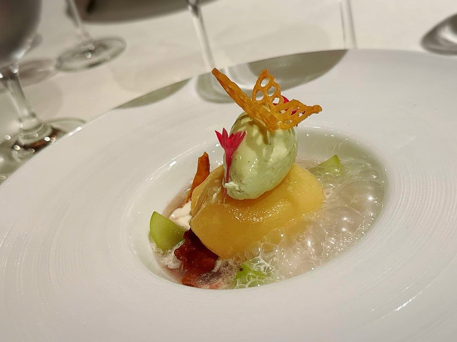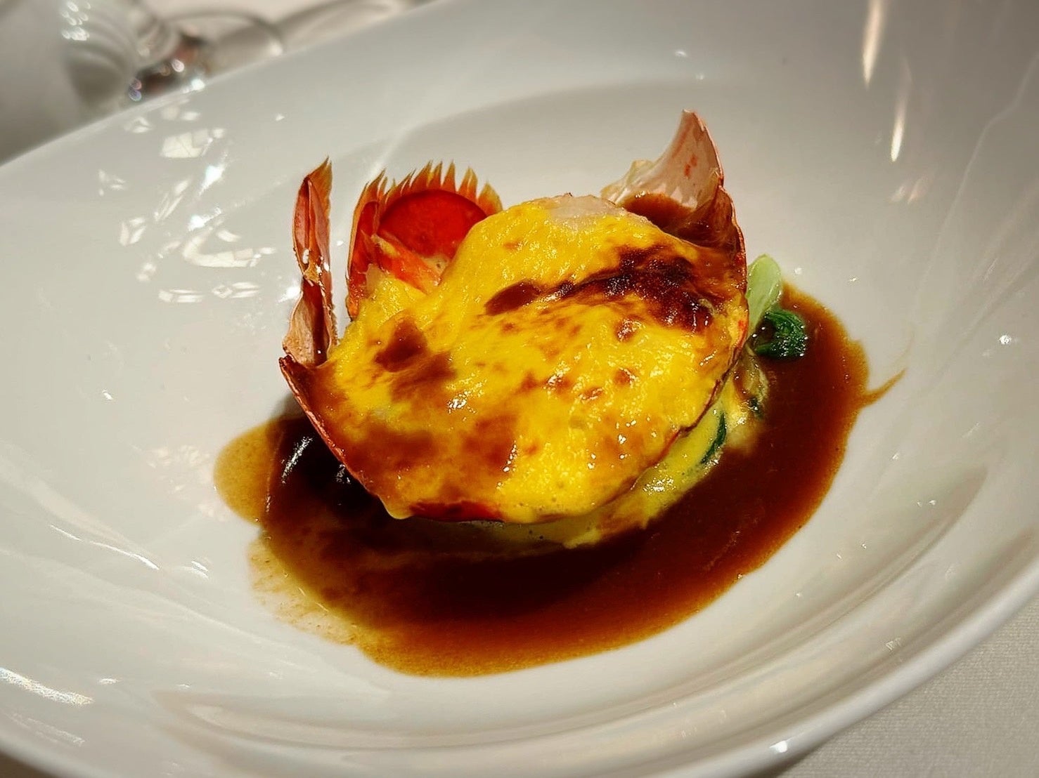 今年は師匠へのオマージュとしてエスコフィエの考案したフレンチのレジェンドレシピにこだわったコース。二人の4つの腕で、お客様一人一人に美味しく楽しんでいただけるよう、いにしえのレシピに忠実ながら、現代の美食家の口に合うものを計算しつくした料理の数々。エスコフィエの真髄で、野菜のうまみを引き出す「マティ二ヨン」を多様に使ったり、「テルミドール」のサバイヨン(ソース)には粉を使わず卵と空気だけ、パンに添えるバターは半分はココナッツバターに、「ピーチメルバ」にはシャンパンを少し注ぐなど、 イベント参加者に、日本の歴史的建造物を舞台に時を超えた特別な食体験をお愉しみいただきました。
