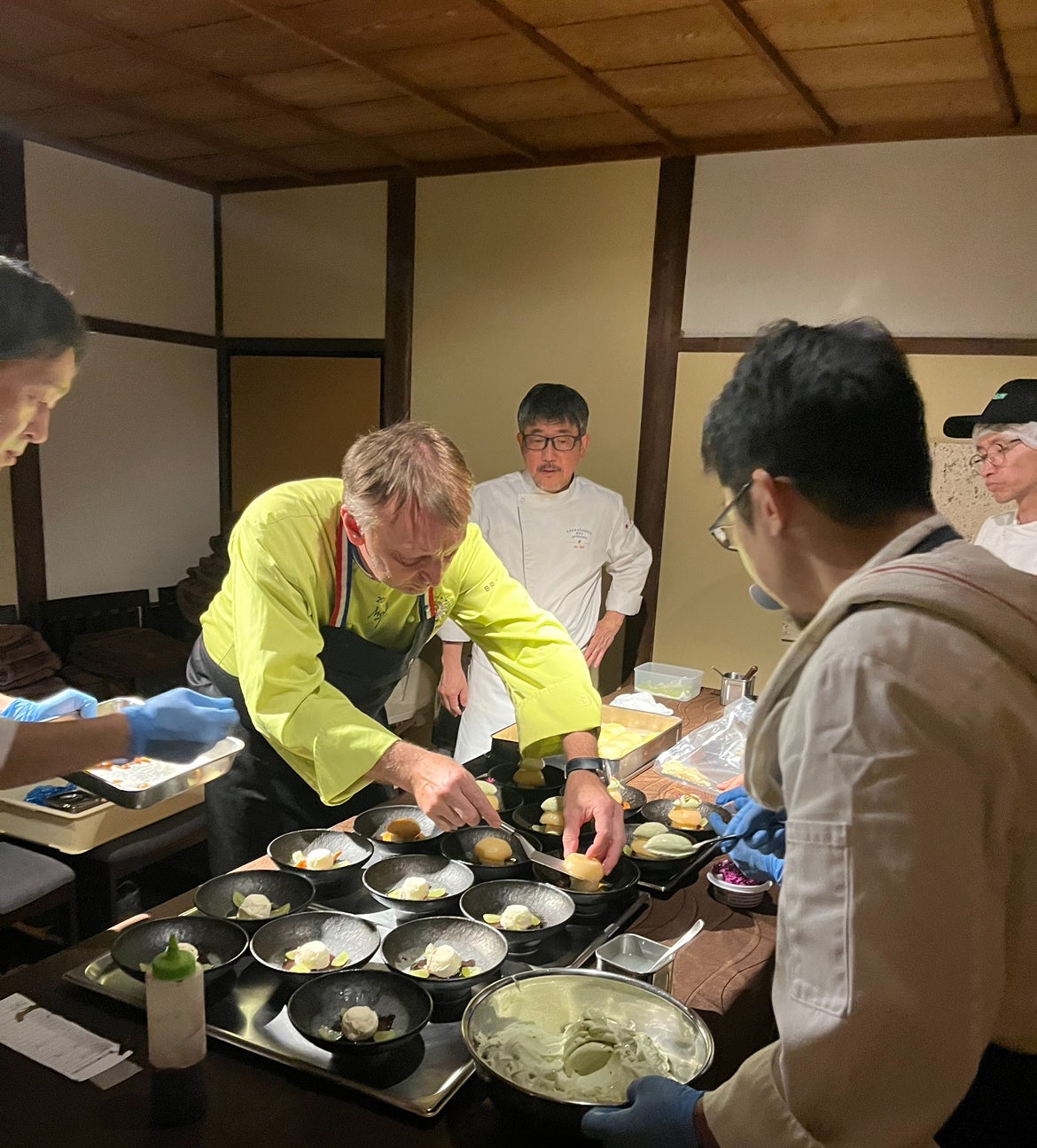 フレデリック・ジョノー氏が、その欧州輸出に携わった功績により愛媛県知事より、新たな特産品として注目を集める「河内晩柑」(海外名Misho)大使に任命された際の晩餐会で、食事を担当した VMG HOTELS & UNIQUE VENUESのエグゼクティブシェフ 石井之悠の料理に一目ぼれ。同じ「エスコフェエの弟子」の称号を持つことや、同年齢であることで意気投合。日仏名グランシェフがタッグを組むガラの開催が決定し、今回はその2回目となりました。