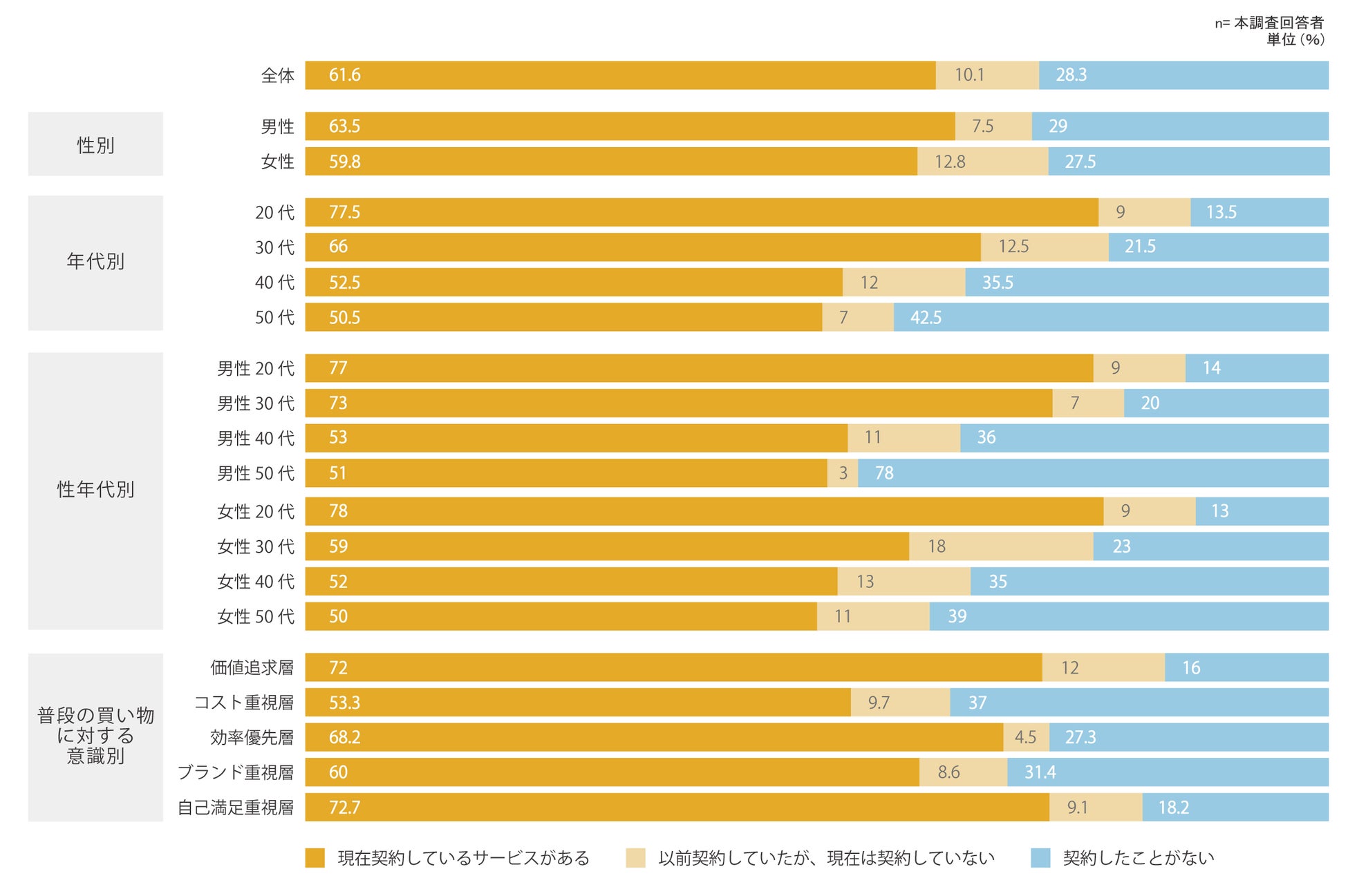「現在契約しているサービスがある」の回答について性年代別でみると、男性の20~30代で70%以上、40~50代で50%以上と顕著な乖離がみられる。また、女性に関しては、20代のみ突出しているという結果が得られた。