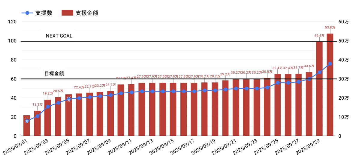 2025年9月1日から9月30日までクラウドファンディングプロジェクトを実施しました。総支援数76件で、目標金額30万円を大きく超えるご支援をいただきました。支援者の皆様の温かいご支援に、深く御礼を申し上げます。