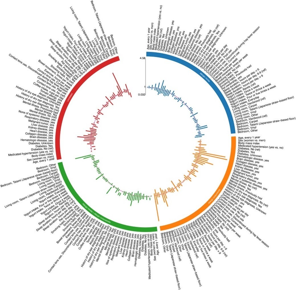 アレルギー性鼻炎とアレルギー性結膜炎の併存と関連する因子として、若年齢 (調整オッズ比 [95%信頼区間]: 0.98 [0.97–0.98])、女性 (1.31 [1.19–1.45])、肝疾患 (1.58 [1.26–2.35])、ドライアイ (1.45 [1.30–1.63])、花粉症のシーズン中のコンタクトレンズ装用の中止 (1.91 [1.16–3.14]) が明らかとなりました。肝疾患ではIgEが増加し、I型アレルギー反応を引き起こすことがわかっており、アレルギー性鼻炎とアレルギー性結膜炎の併存と関連した可能性があります。