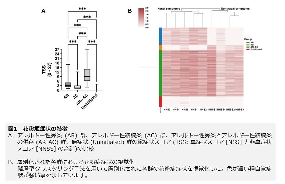 アレルギー性鼻炎とアレルギー性結膜炎の併存群は、アレルギー性鼻炎群、アレルギー性結膜炎群と比較して、NSS、NNSSにおいて有意に高いスコアを示しました (図1A)。また、各群における花粉症の症状を階層型クラスタリングの手法を用いて視覚化しました (図1B)。