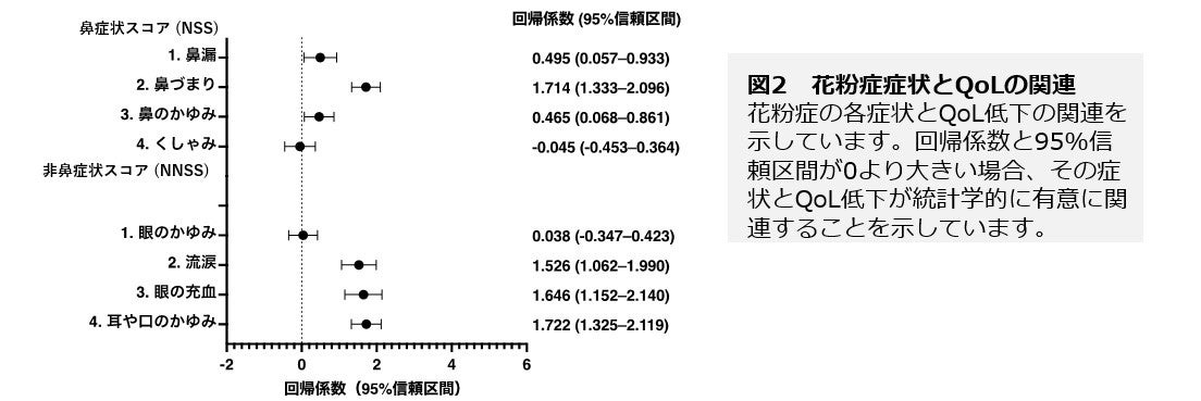 花粉症症状のうち、耳や口のかゆみ (回帰係数 [95%信頼区間]: 1.722 [1.325–2.119])、鼻づまり (1.714 [1.333–2.096])、眼の充血 (1.646 [1.152–2.140])、流涙 (1.526 [1.062–1.990])、鼻漏 (0.495 [0.057–0.933])、鼻のかゆみ (0.465 [0.068–0.861])が有意にQoL低下(JACQLQで評価)と関連していました (図2)。
