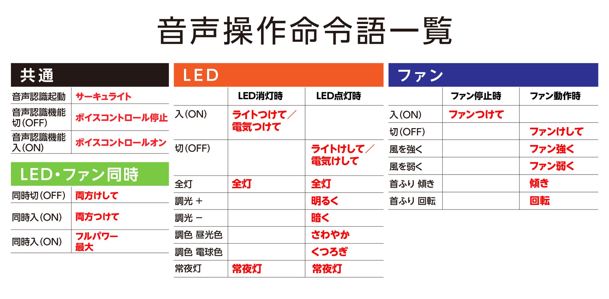 サーキュライトとして初めてとなる音声認識機能は、本体に向かって「サーキュライト」と話しかけるとスイッチが青く光り、起動します。その後、指定の命令語を話しかける事で、リモコンを使わずLEDとファンを操作することができます。Wi-FiやBluetooth®等の無線接続不要で、本体を設置するだけですぐに使用することが可能です。勿論、リモコンでの操作も可能です。