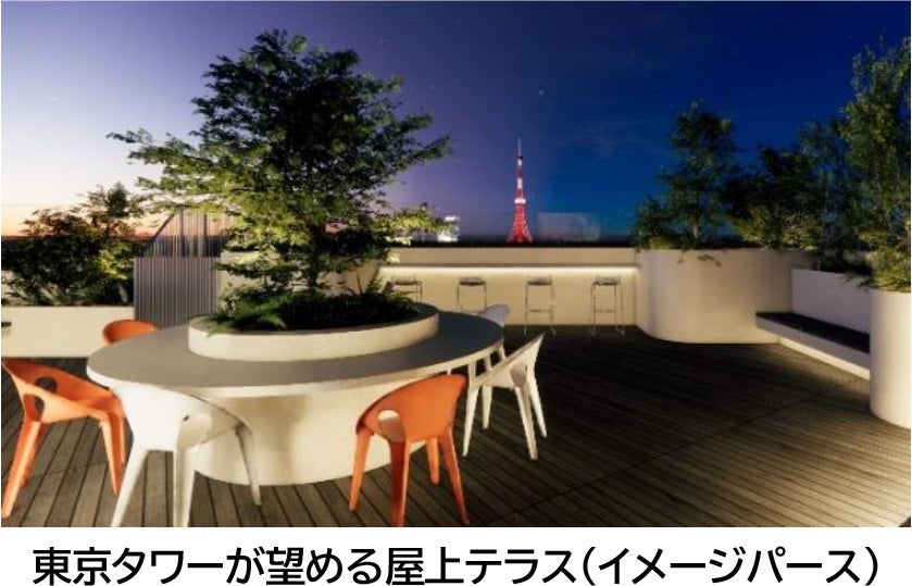 屋上にはワーカー専用のテラスを設置します。東京タワーを望みながら、働き、憩うことができる、2つの顔を持つ空間となっており、執務用の電源を備えた快適なワークスペースとして、また、開放的な眺望が楽しめるリフレッシュスペースとして、気分に合わせた活用が可能です。