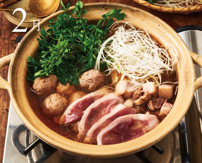 寒さが厳しくなる時期に。75日間じっくり育てた合鴨「京鴨」の、脂の甘みと赤身の旨みがしみわたる鍋の詰め合わせ。合鴨ガラベースの特製スープでお召しあがりいただきます。生姜が香るつみれは、長芋を加えてふっくら柔らか。粉山椒がよいアクセントです。〆にさぬきうどんを入れ、最後の一滴までご堪能ください。