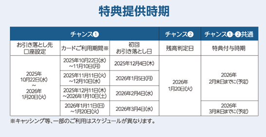特典の付与は、チャンス①・②とも、お一人さま1回限りとさせていただきます。また、お振込の時期は変更となる場合がございます。