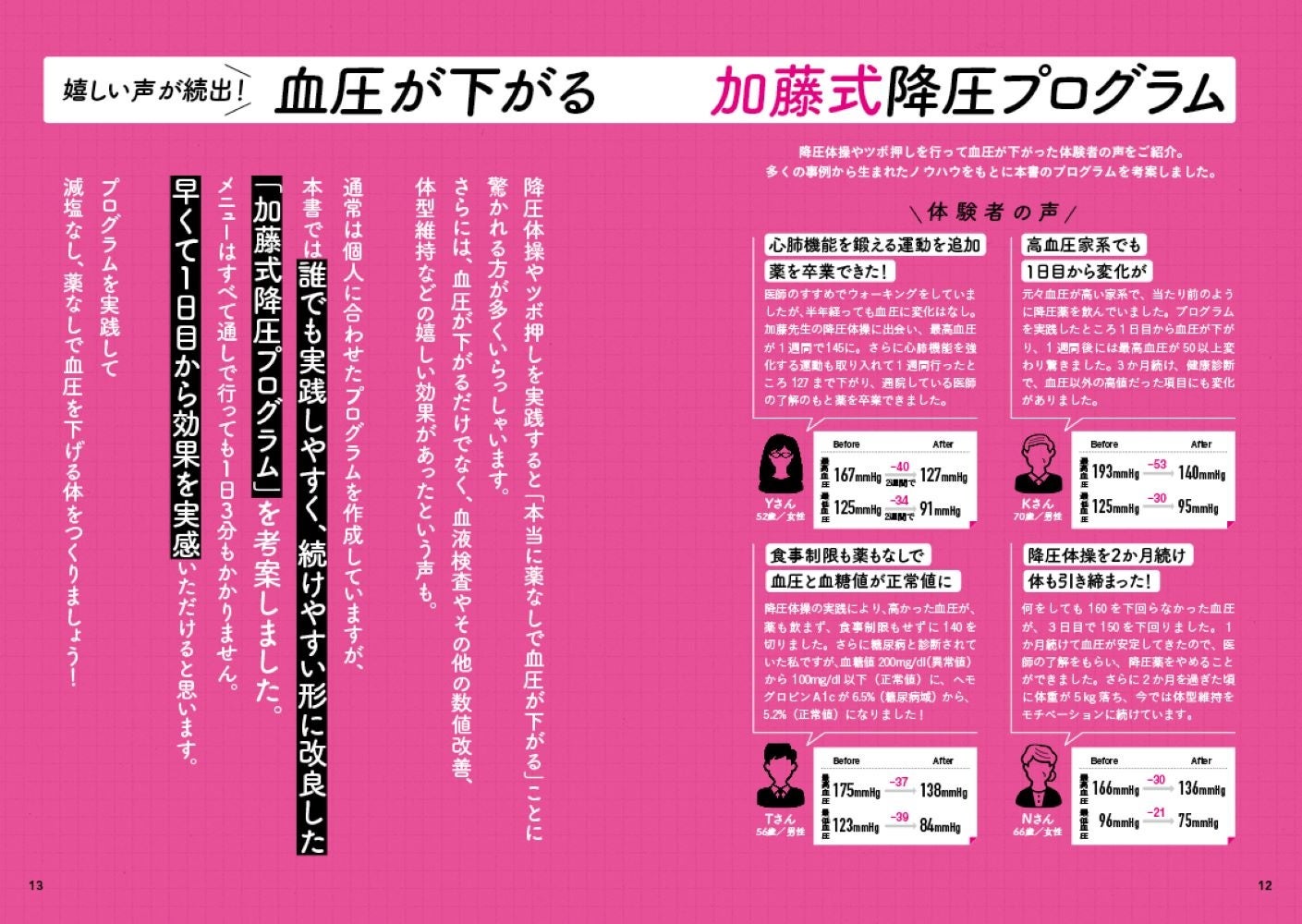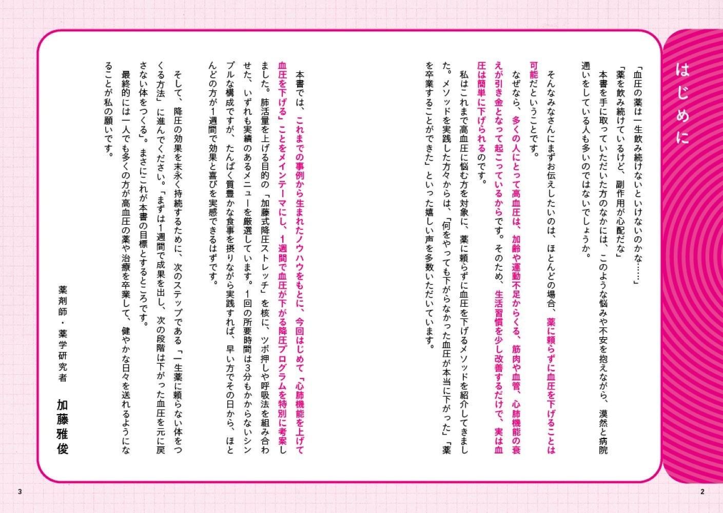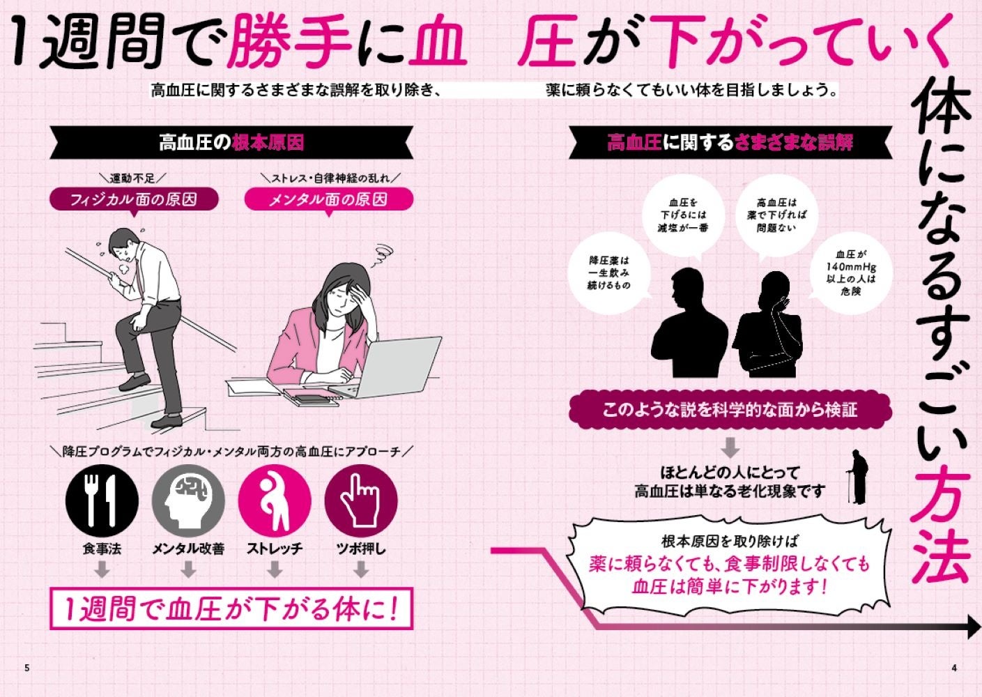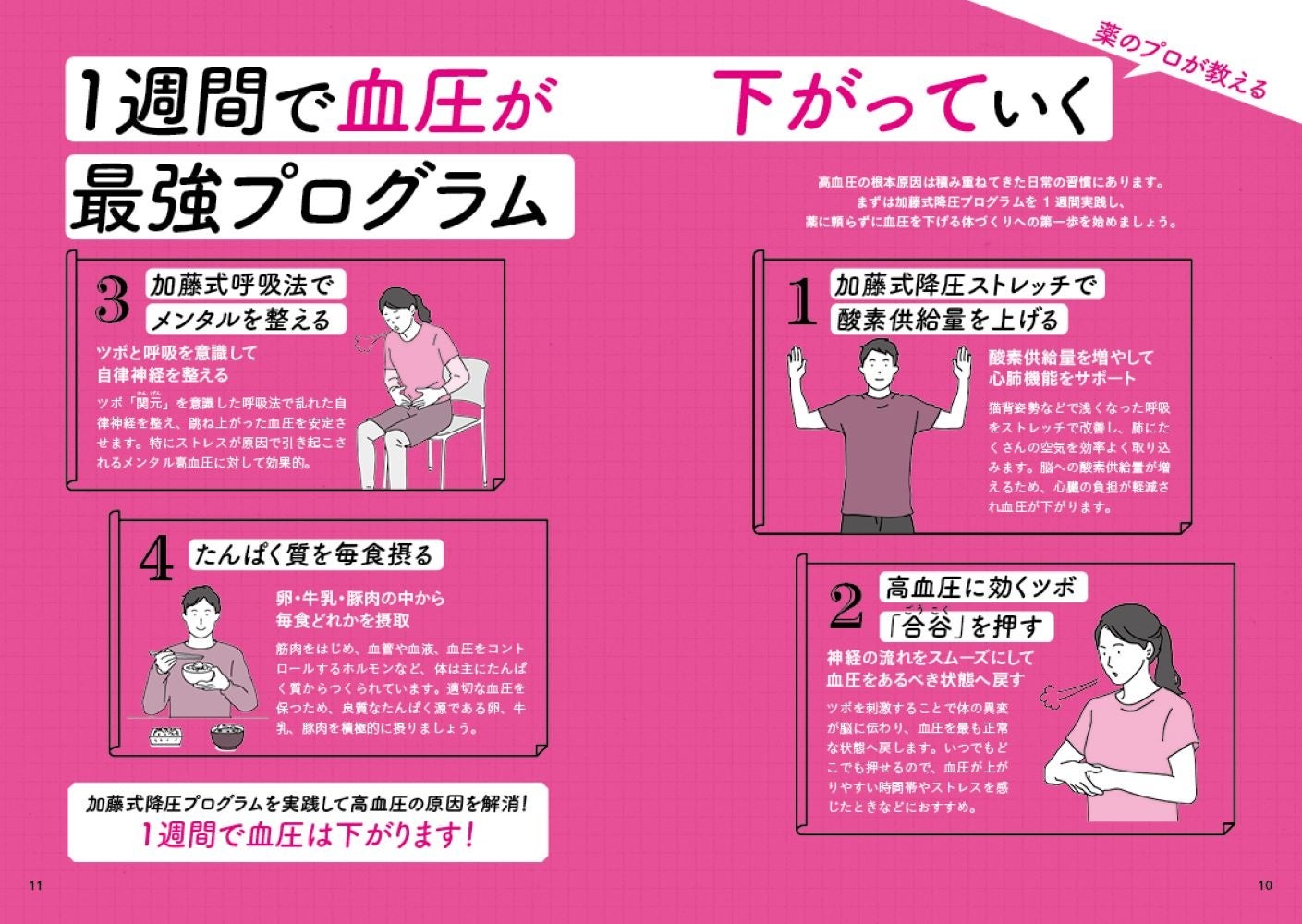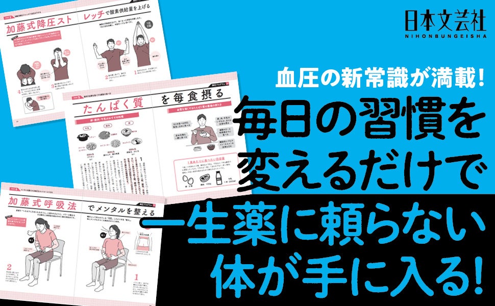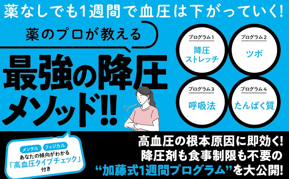 その上で、肺から血圧にアプローチする『胸郭ストレッチ』、押すだけで10以上下がる『降圧ツボ』、心も体も整う『加藤式呼吸法』など、時間もかからず誰でも即できるのに、驚くほど効果がある方法を毎日取り入れやすい1週間プログラムにして紹介します。