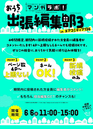 6/6(日)「COMITIA136」では、新型コロナウィルス感染症予防対策のため、会場での出張マンガ編集部は実施されません。「マンガラボ!」では同日開催される「エアコミティア136」に合わせて、オンライン上で誰でも参加できる「おうちで出張編集部3 in エアコミティア136」を実施します。たくさんのご応募、お待ちしております。
