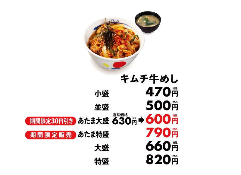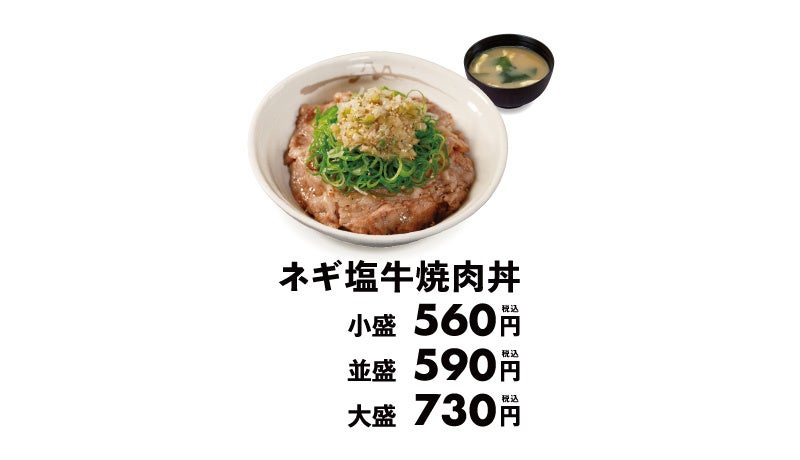 商品名 ネギ塩牛焼肉丼 590円(小盛560円/大盛730円) キムチ牛めし 500円(小盛470円/あたま大盛630円/ あたま特盛790円/大盛660円/特盛820円) ※お持ち帰りいただけます。お持ち帰りにみそ汁は付きません。 お持ち帰りの場合、みそ汁は別途60円でお求めいただけます。 ※税込み価格です。 ※キムチ牛めしあたま特盛の販売期間は9/19 15時~10/31 10時までです。 ※キムチ牛めしあたま大盛は10/31 10時まで30円引きの600円で販売いたします。 ※キムチーズ牛めしは9/19 15時に終売となります。