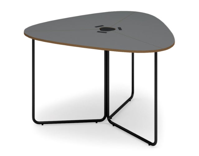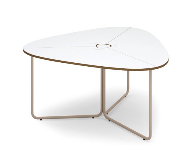 訪問者が話しかけやすく、その場でのペアワークを始められる三角形のテーブル形状です。テーブルについた同士でも会話がしやすく、チームテーブルとしても活用できます。テーブルサイズは、幅1770㎜×奥行1700㎜、幅1465㎜×奥行1390㎜の2タイプがあり、高さも900㎜と720㎜からお選びいただけます。