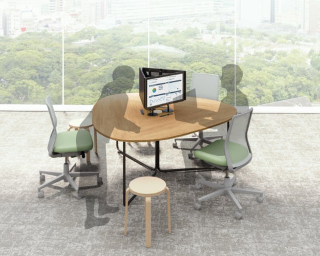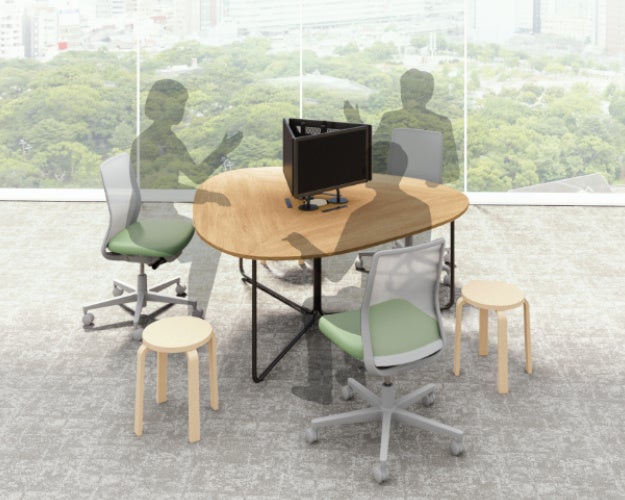 当社は、2020年からカフェテーブルシリーズ「Franka」を販売しています。この度、ラインナップを拡充し、より気軽な対話を生むチームテーブル(コの字脚テーブル)が新登場します。特徴的な三角形のテーブル形状で、訪問者が話しかけやすく、テーブルについた同士でも会話がしやすい環境を実現します。その席の役割によってお選びいただけるよう、リラックス感を演出する植栽や、作業効率の向上を狙ったモニターもご用意しています。また、テーブルの高さは720㎜と900㎜からお選びいただけます。
