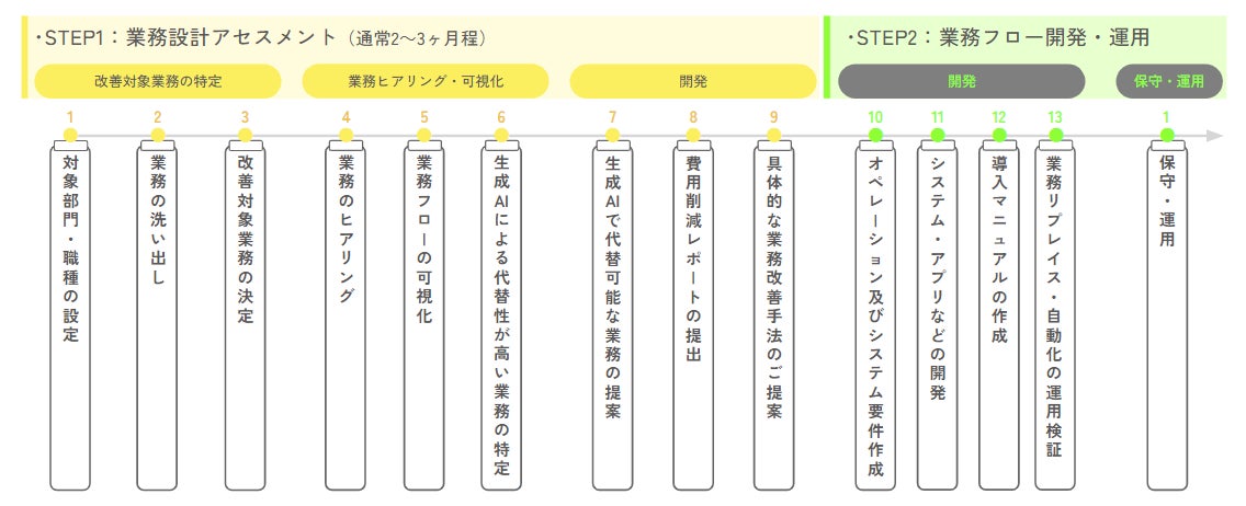 生成AIコンサルティング基本契約 ・生成AIによって解決しうる業務の洗い出し ・業務オペーレーションに合わせた生成AIを組み込んだ業務設計 ・生成AI導入による売上向上、コスト削減効果のレポート |
