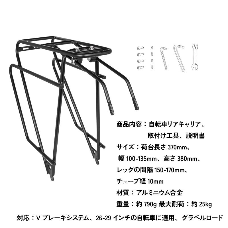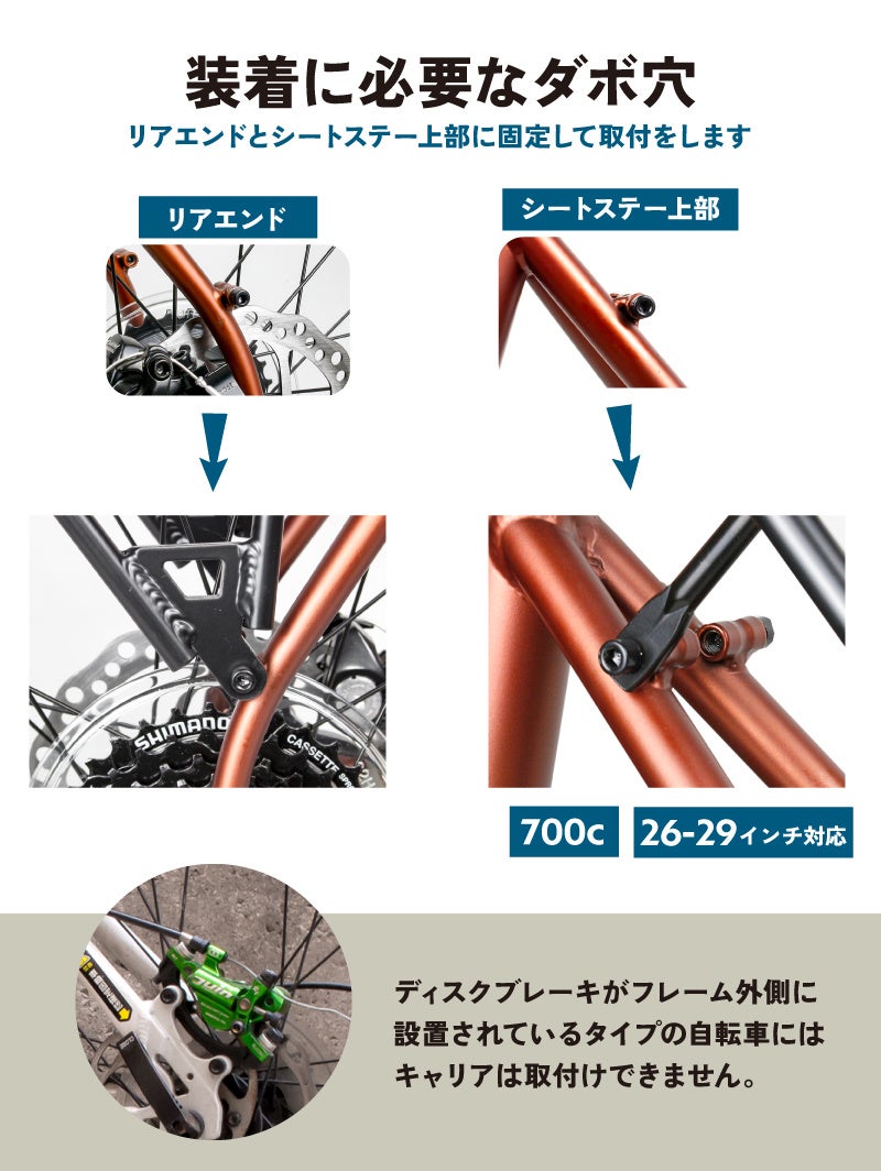 ダボ穴が付いたクロスバイクやMTB、グラベルロードなど26-29インチ/700cの自転車に対応しています。