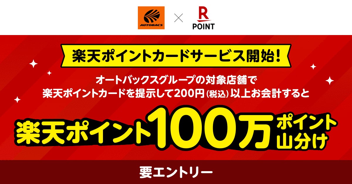 キャンペーンにエントリーのうえ、「オートバックスグループ」の対象店舗で「楽天ポイントカード」もしくは「楽天ポイントカード」機能が搭載されたアプリ、または「楽天カード」裏面のバーコードを提示して200円(税込)以上の会計をした方に、「楽天ポイント」100万ポイントを山分けで進呈します。 |
