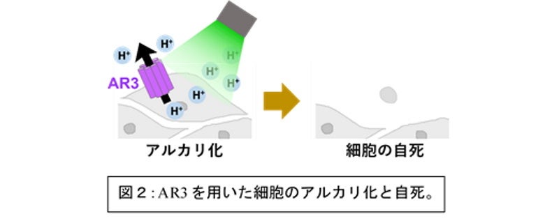 - 細胞をアルカリ化する光感受性タンパク質を用いることで、光で狙った細胞を死滅させる新技術を開発しました。