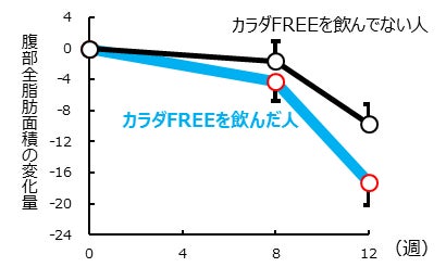 (25≦BMI<30の成人男女200名にプラセボ飲料または「カラダFREE」350ml缶を1日1本12週間接種し続けていただいたヒト試験結果)