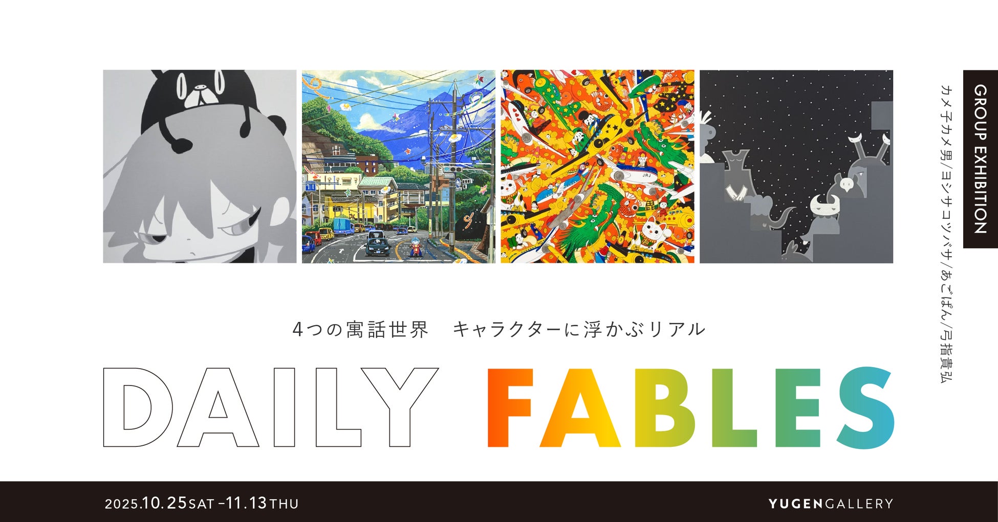 YUGEN Gallery FUKUOKA(福岡県福岡市中央区大名2-1-4 ステージ1西通り4F)では2025年10月25日(土)よりグループ展「Daily Fables」を開催しております。参加するのは、あごぱん、カメ子カメ男、弓指貴弘、ヨシサコツバサの4名。キュレーションは野間博尊が担当します。