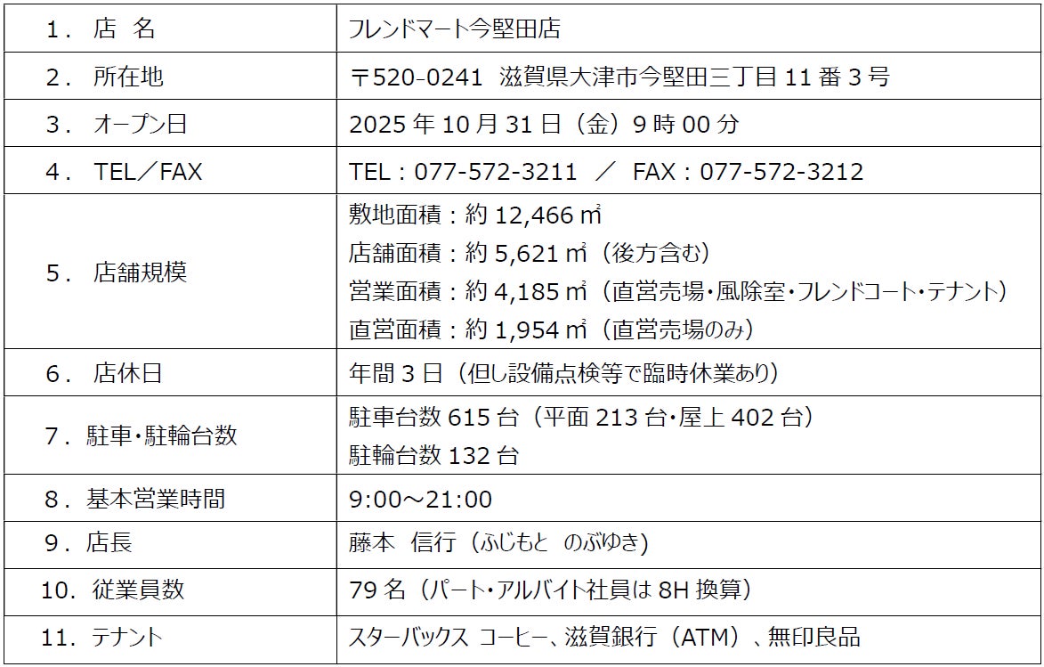 株式会社平和堂(滋賀県彦根市、代表取締役社長執行役員CEO:平松正嗣、以下「平和堂」)は、2025年10月31日(金)あさ9時00分、滋賀県大津市にフレンドマート今堅田店(以下「当店」)をオープンします。当店のオープンにより滋賀県内は82店舗、平和堂は全167店舗となります。