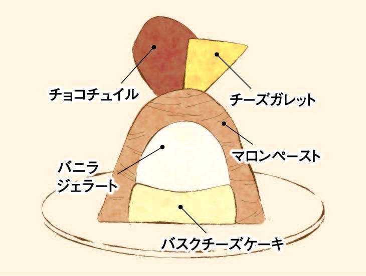 「バスクチーズケーキモンブラン」は、クリームチーズをたっぷり使ったバスクチーズケーキにバニラジェラートをのせ、イタリア栗を使ったマロンペーストをたっぷりしぼった一品です。トップには食感と風味にアクセントを加える、チョコチュイルとチーズガレットをトッピングしています。コクがありなめらかな口当たりのチーズケーキと、しぼりたてならではのふんわり食感が特長の濃厚マロンペースト、すっきりとした味わいのバニラジェラートが織りなす、至福の味わいをご堪能いただけます。バスクチーズケーキとモンブラン、2つのおいしさを一度にお楽しみください。