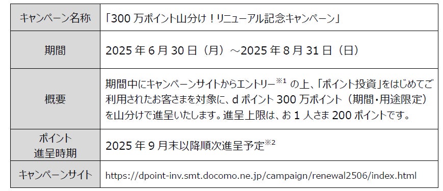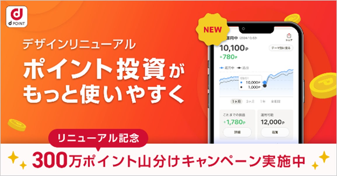 株式会社NTTドコモ(以下、ドコモ)は、dポイントで投資体験ができるサービス「ポイント投資」(以下、本サービス)について、2025年7月1日(火)にアプリおよびサービスサイトのデザインをリニューアルいたします。リニューアルを記念して、「300万ポイント山分け!リニューアル記念キャンペーン」を2025年6月30日(月)から2025年8月31日(日)まで開催いたします。