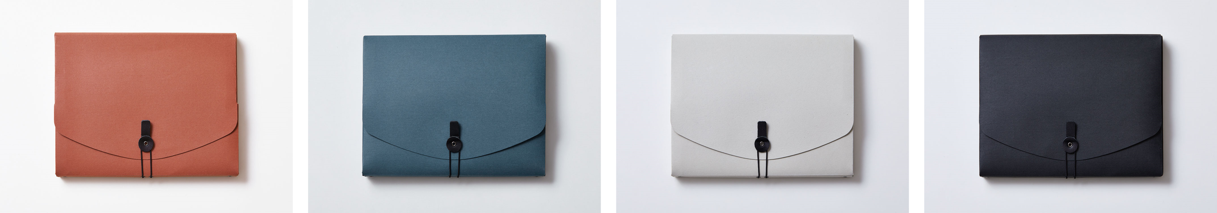 サイズはA5とA4の2種類で、カラーはカジュアルにもビジネスにも使いやすい落ち着いた風合いのアカ、ネイビー、ライトグレー、クロの4色展開です。